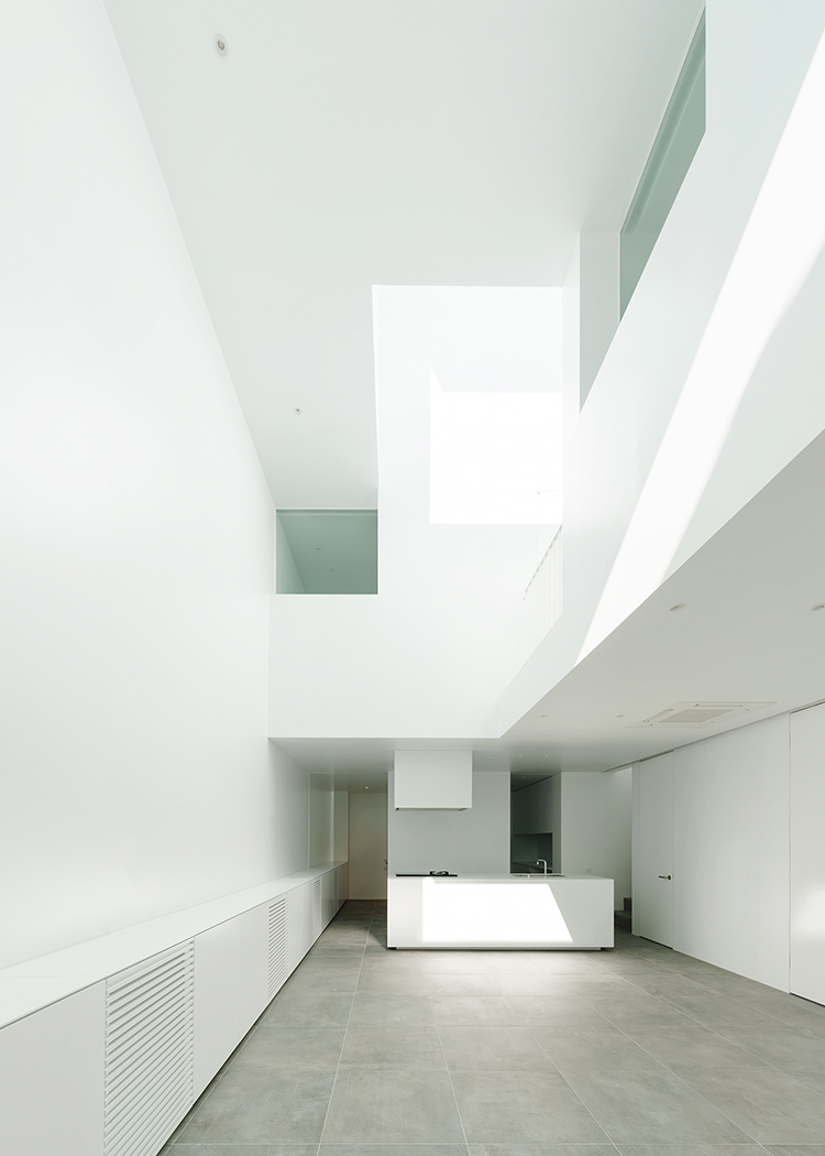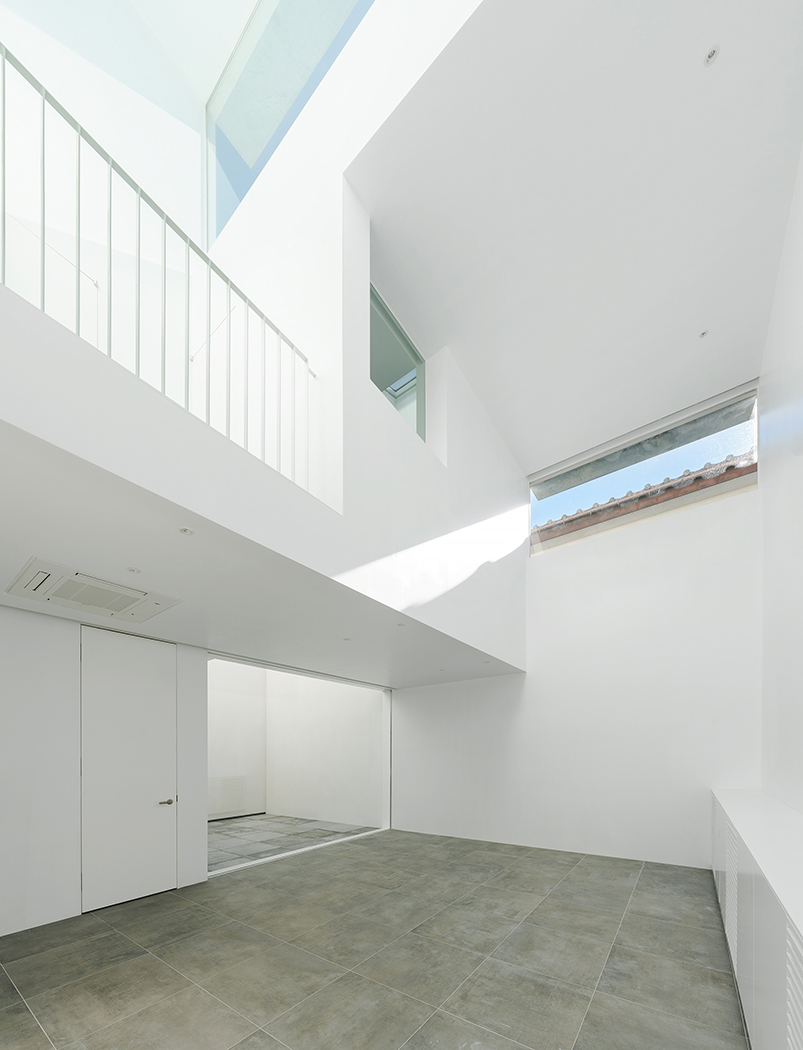 「8つの光庭」を操り敷地内に散在させる事で、適所に光を内部に導き入れ、豊かな内外部空間が点在する、家族4人が住まう家。