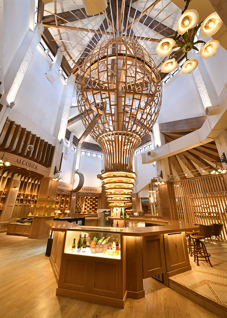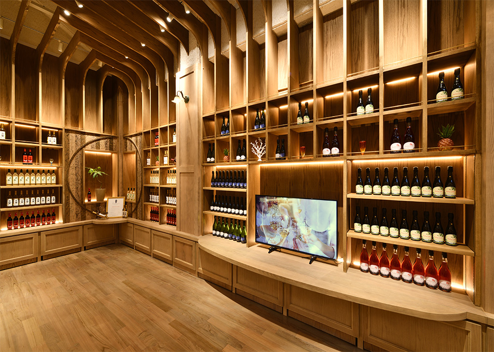 エントランスを抜けると最初に目に入る高さ14mの巨大な「Pineappleアートオブジェ」がそびえ立ちます。その周りには、ワインの試飲や軽食ができるカウンターとBARラウンジを設け、大人が楽しめるインパクトのあるワイナリーリゾート空間が完成しました。