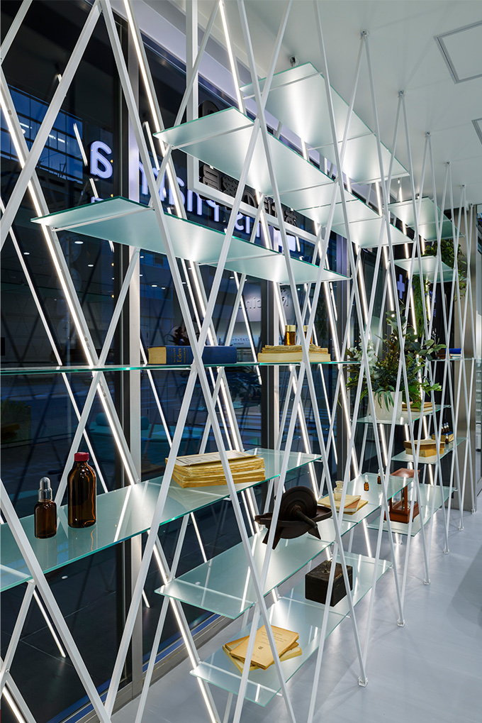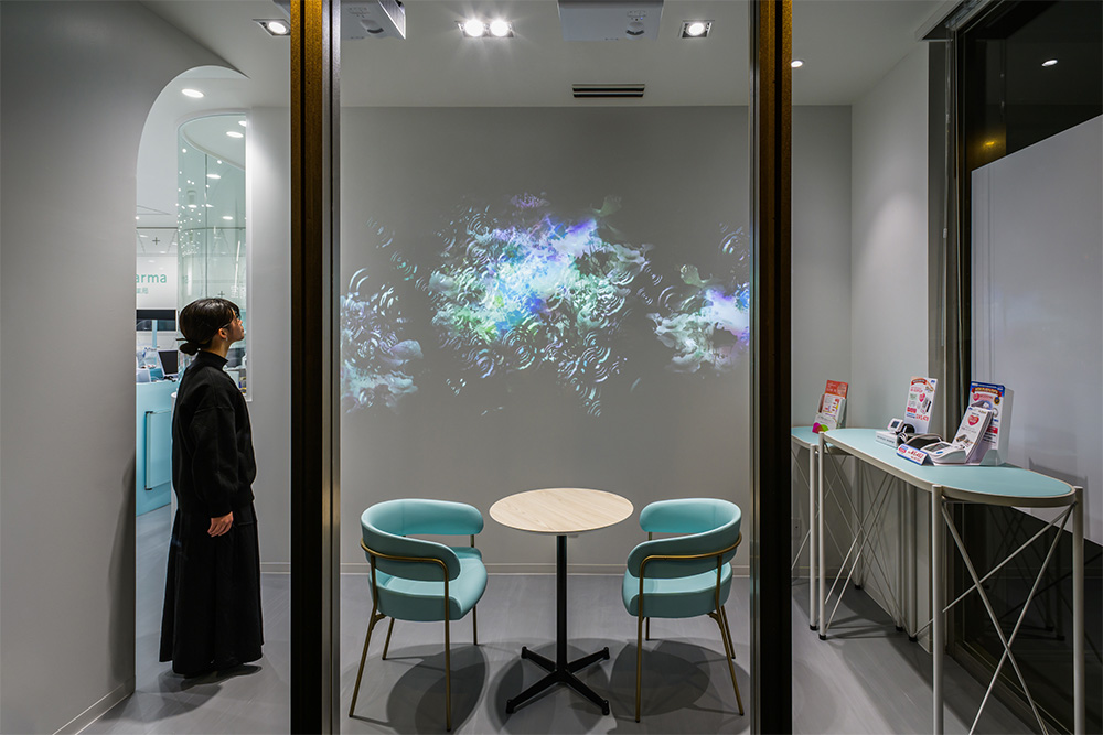 開放感と清潔感の柔らかさの構成と映像演出の融合|あけぼの薬局神田店