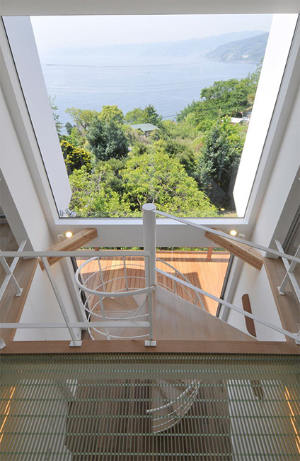 ひとつ目は、神奈川県真鶴町の海を望む敷地に設計した「海を眺める望遠鏡」と題した作品ですね。これは、「どの部屋からも海をみたい」というシンプルな建主様のご要望にこたえるべく、料理をしながら・・、お風呂に入りながら・・、寝室から・・、階段で次第に広がる大海原を楽しみながら・・、玄関に入った瞬間から・・、あらゆる部屋からフレームサイズとアングルの異なった「海を眺める望遠鏡」を建築しよう!というコンセプトのファーストプランがカタチとなった事例です。