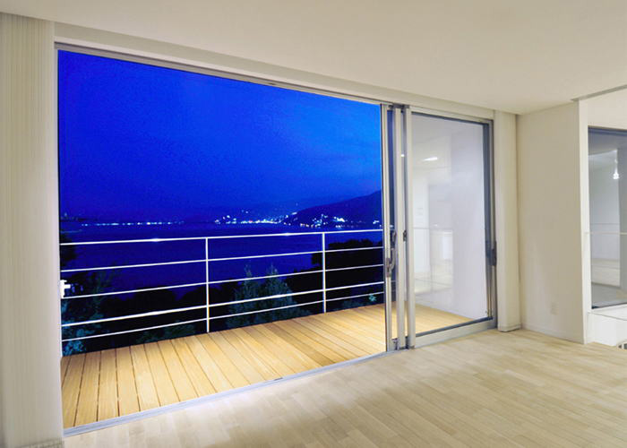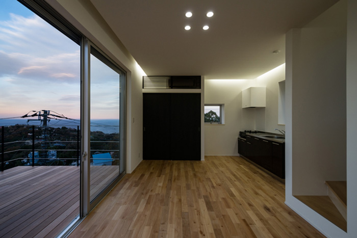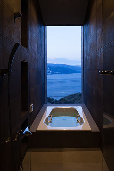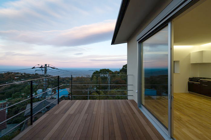 富士山、熱海市街、真鶴半島、三浦半島、房総半島、初島、伊豆大島まで望む、180°以上の絶景を楽しむべく、10帖のテラスをリビングテラスとして配置した点と、低予算でも実現を可能にした、在来工法省スペース「縦入り」の展望風呂が特徴的な計画です。
