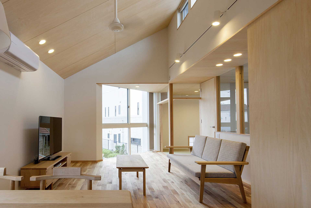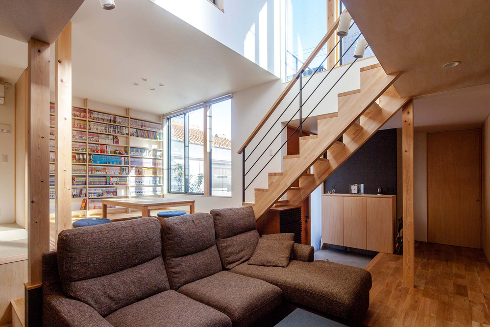 以前、設計させていただいた住宅で、ご主人の実家の庭に建てることになったものがあります。庭がなくなるご実家への採光と、この住宅への日中の採光の確保が求められました。建物形状をご実家に配慮したものとした上で、隣家の屋根より高い位置に設けた窓から光を下階へ導くことにしました。