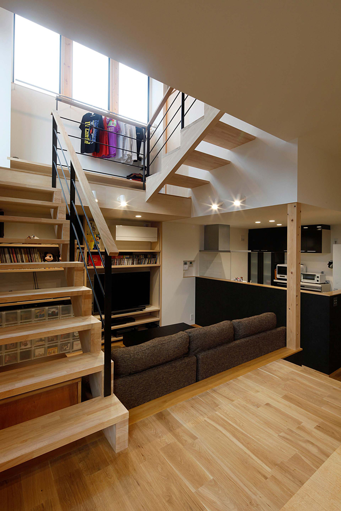 スキップした階毎に趣味のコレクションなどが現れる、明るく楽しい住宅となっていますが、難しい条件を解決することが、この空間を生み出すきっかけになっています。