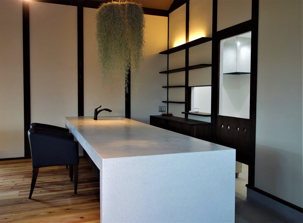 真壁漆喰、寒水石研ぎ出しカウンター・ひふみ石たたき土間を計画し、木箱の中で藁に包まれて残っていた大正時代の小型の吊り灯具3個をメインテーブル席の上へ。 灯具は四角柱型で下部は四角錐型。壁へ鶴首ブラケット。