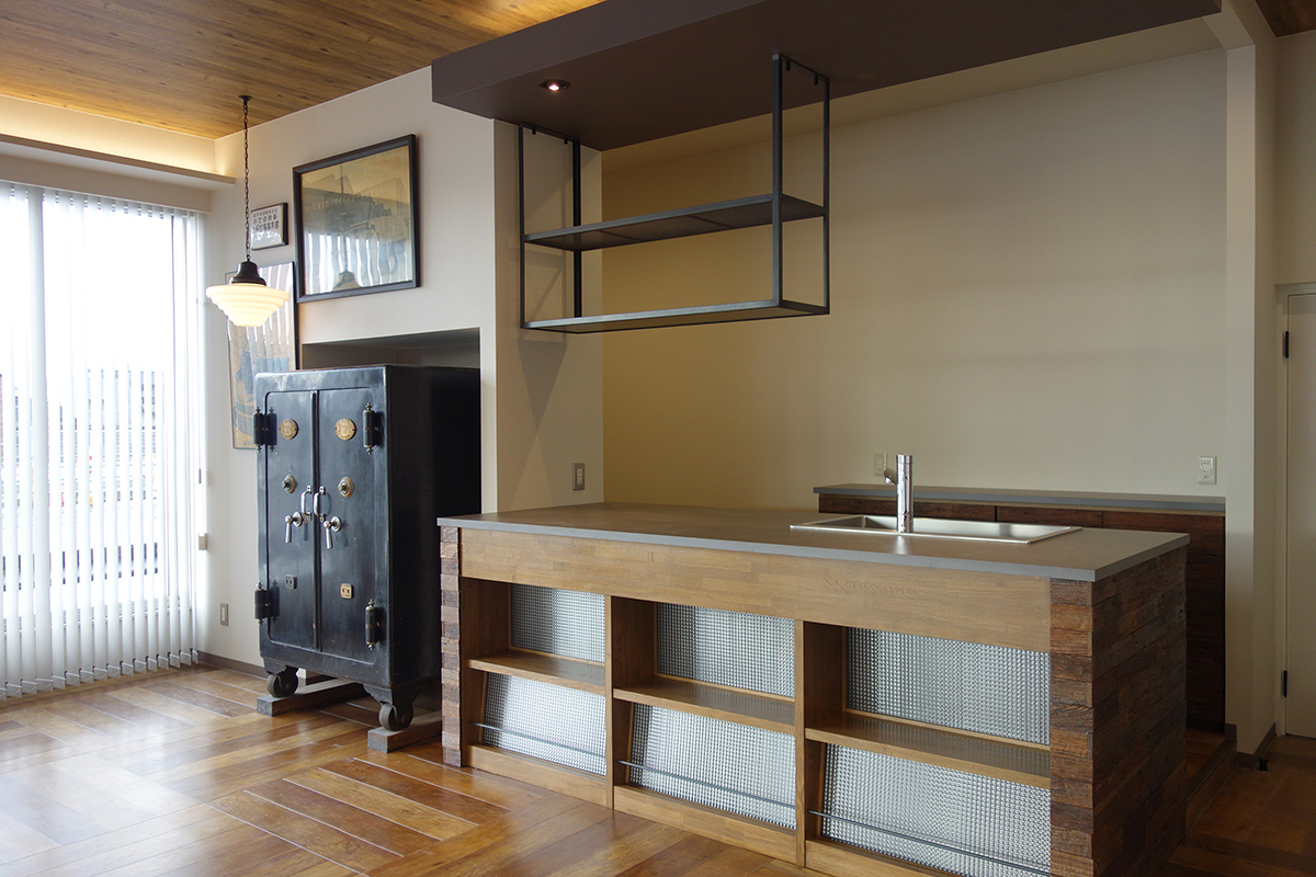 戦前頃のアンティーク大型金庫・同時代の車ポスターとあわせ大正時代の丸段々型の吊り灯具。 古材を活用し製作したオープンキッチン対面棚の背面へ既存建物につけられていた戦前頃のチェッカーガラスを活用。