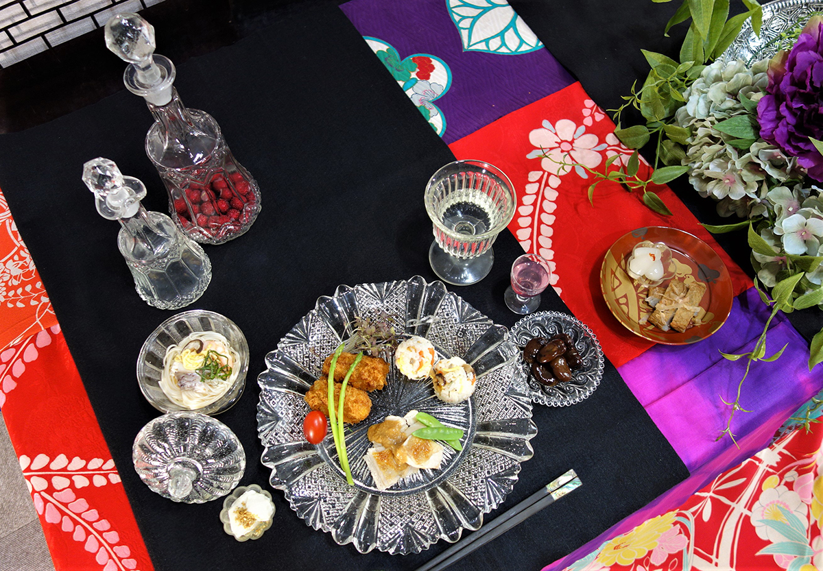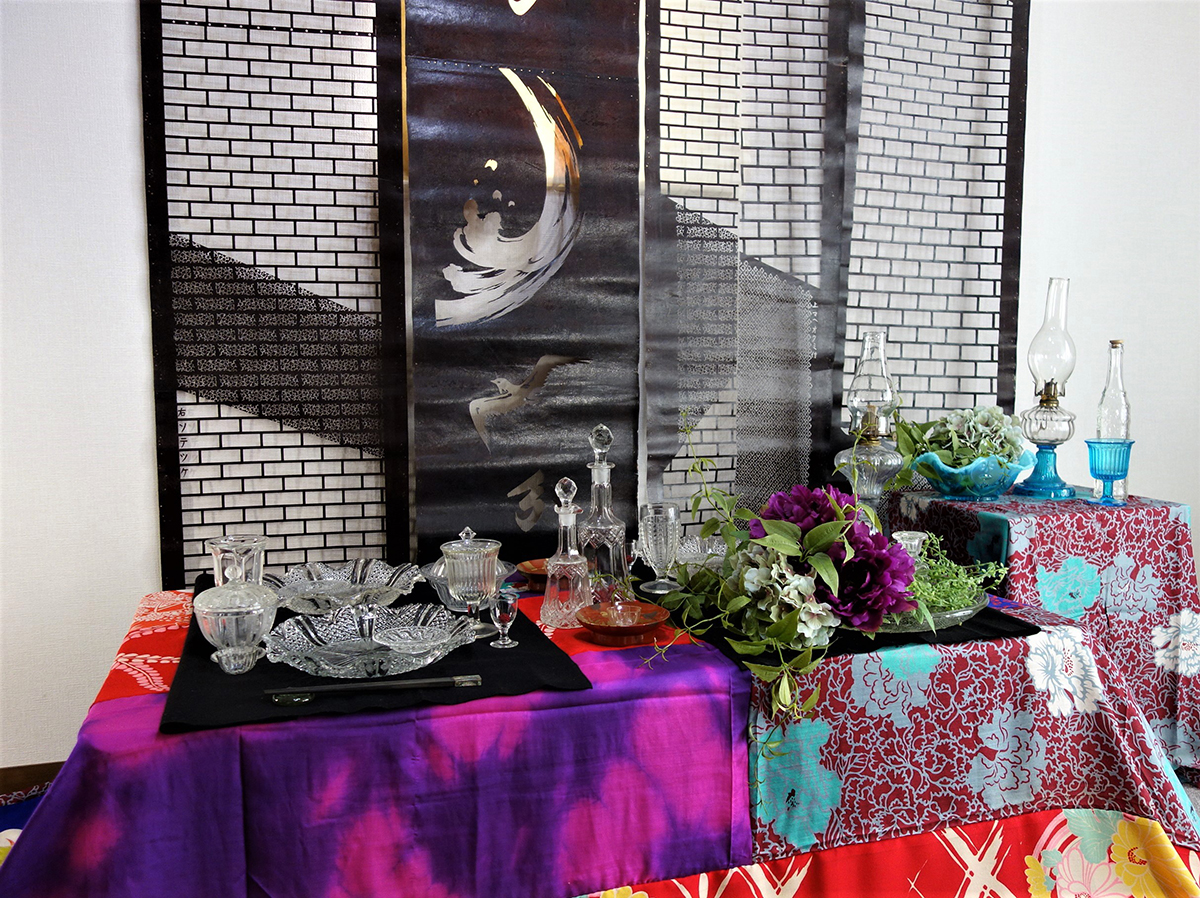 明治時代の八割り大皿・小皿・ぼんぼん入れ、戦前の梅型ゼリーガラス器、明治の松竹と千鳥柄の漆皿に盛り付け。大正のワイングラス・リキュールグラス、オイルランプ・ディキャンタ。昭和初期のガラス蹴りを箸置きに。大正頃の着物古布をテーブルクロスに縫い直し、波千鳥柄の着物の染型を壁装に。装花は牡丹・紫陽花・利休草。(2020年テーブルウェアフェステバル入選・東京ドーム展示作品)