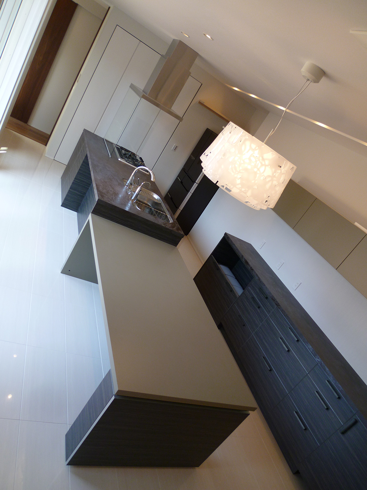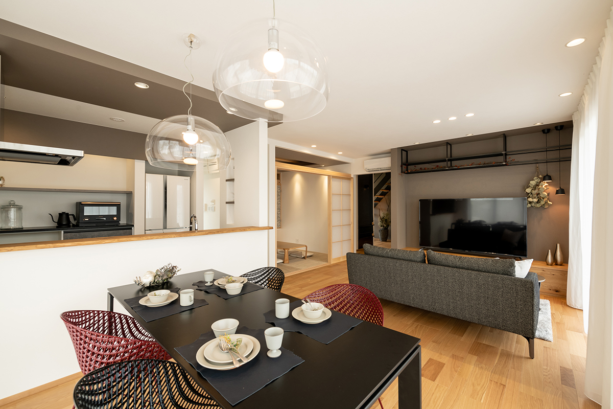 モダンスタイルに大正時代のガラス照明器具などを取り入れる空間づくりをしています。