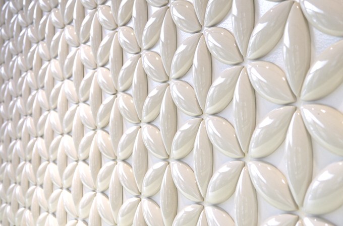 「ヒシガタ」はその名の通り、立体的な菱形のセラミックタイルです。菱型の組み合わせ方によって、さまざまなパターン張りをできるのが特徴。凹凸があるので、ライトアップすると美しい陰影を楽しめます。