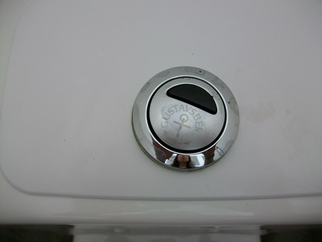 このボタンを押すと水がタンクから流れます。北欧のトイレにはこの形が多いです。エコのために大小一つのボタンがあるタイプもあります。