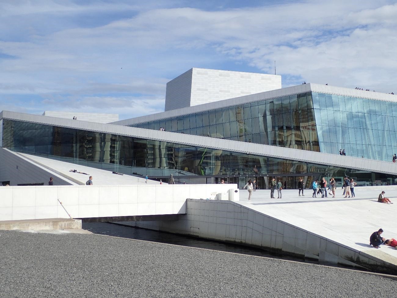 オスロの湾にあるダイナミックな建物オスロ・オペラハウス。ガラスタイルの白い外壁と大きなガラスが印象的な建築でした。