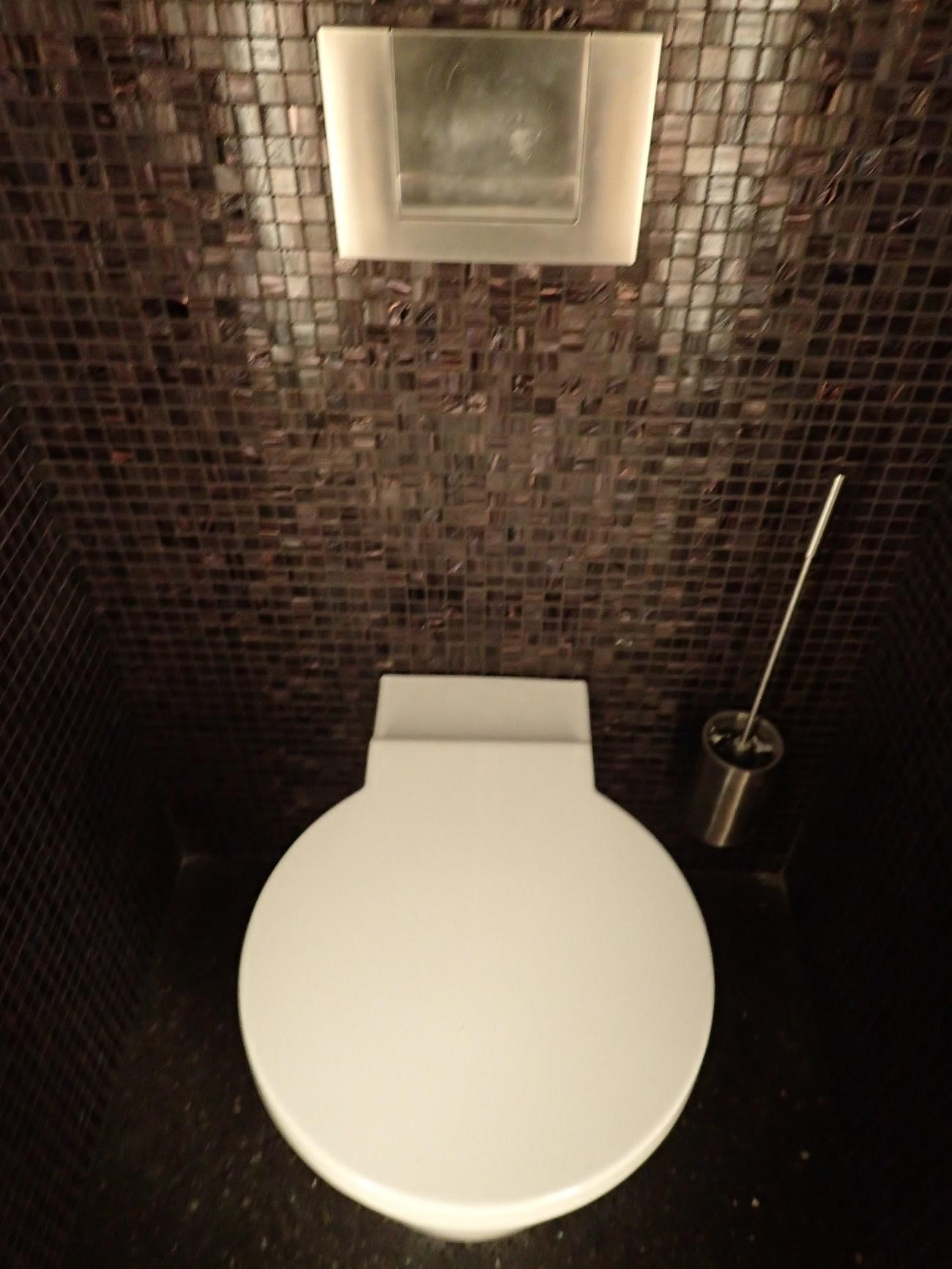 トイレの内装もガラスタイルが使用されていました。上には水を流すボタンが。