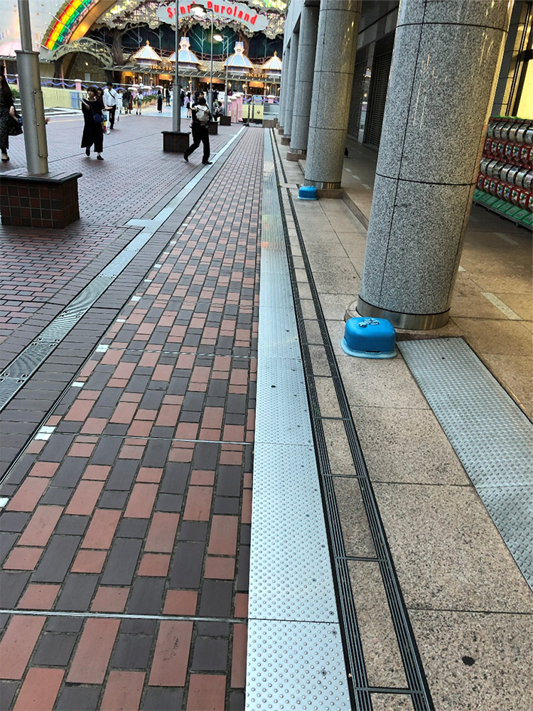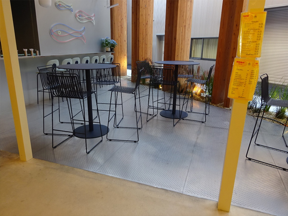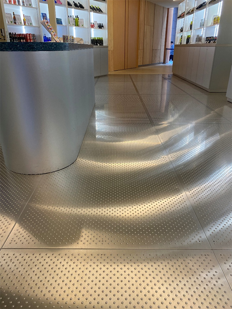 熱延鋼板をベースにしている一般的な滑り防止床材と比べ、ヘアライン仕上の冷延鋼板をベースにしている当社の「すべらんなー」は、表面の金属光沢感や、水玉状の突起形状がデザイン的に優れており、スペイン館のイメージにマッチするとの評価が得られたため、採用に至りました。