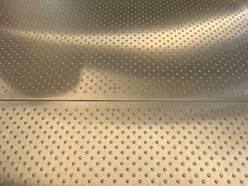 - 光沢感のあるSUS304ヘアラインをベースに、水玉状の突起を与えた当社の「すべらんなー」は高い滑り止め性能と、意匠性や良好な清掃性を兼ね備えています。