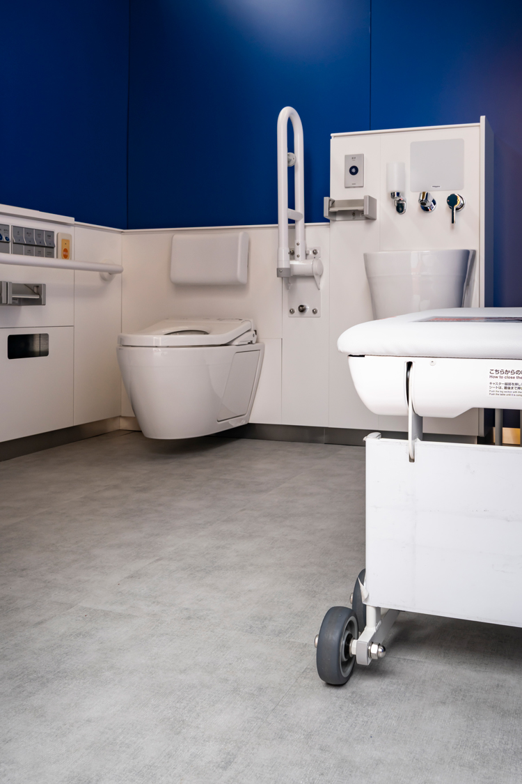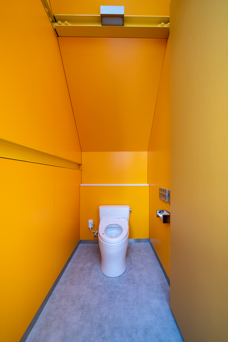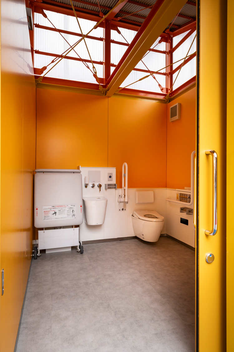 今回トイレ5を設計した建築家の米澤隆氏は、床に使用した「メラミンタイル」について「基本的には屋内向けの素材とのことですが、ひとつの区切りである万博の会期が半年間である点を活かし、実験的に半屋外で使用しています。