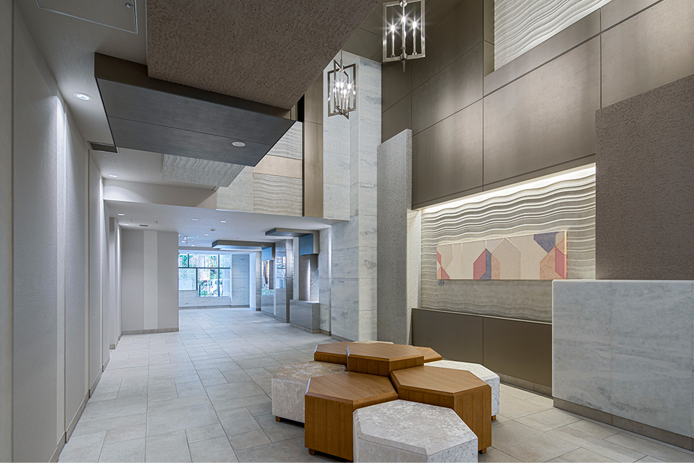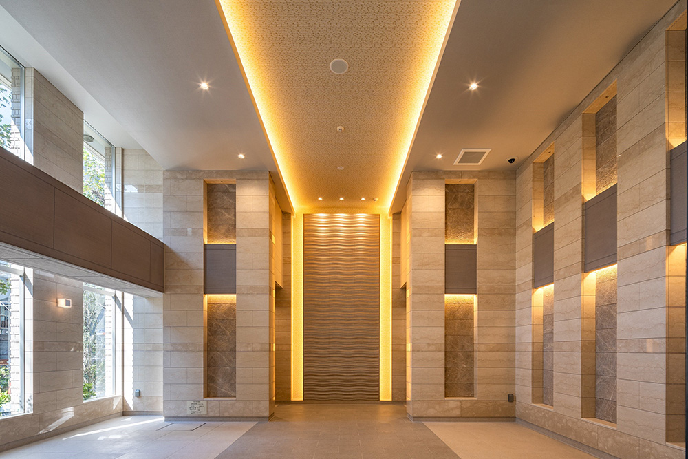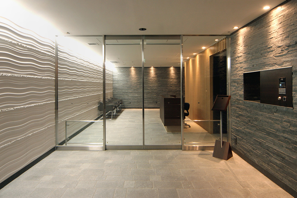 〈3DWALLISE〉は、商業ビルやマンションエントランス、オフィスのエントランス等によく使用されております。中でも三菱レジデンス様の高級賃貸マンションエントランスや、大成建設様の分譲オクションエントランス部分には、不燃立体装飾パネル〈3DWALLISE〉と不燃フラット装飾パネル〈WALLISEboard-K〉、両方をスペックインされ、安価に仕上がったと大変ご評価いただいております。