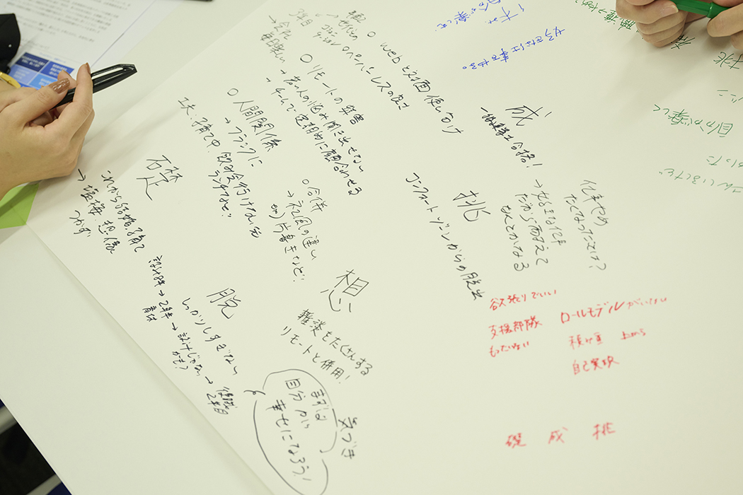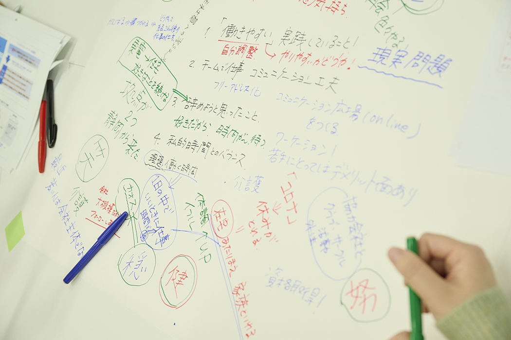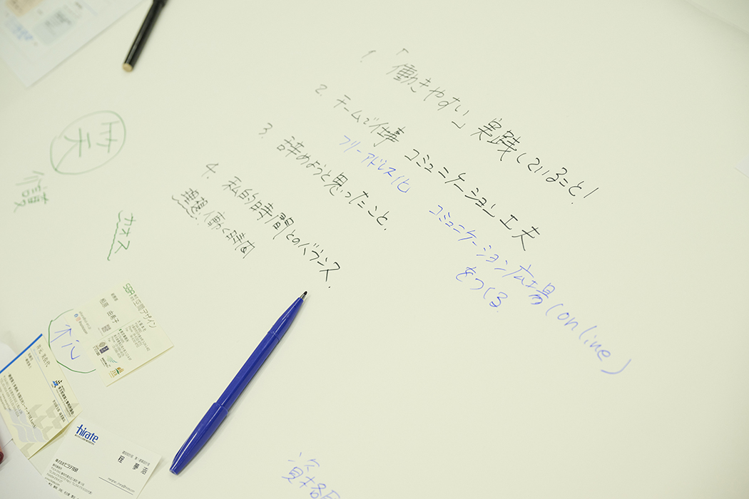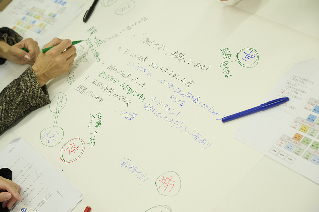 今回は「個人と事務所が共に成長できる、フラットで自由に発言できる職場の雰囲気づくり」をテーマに自身の課題や悩みなど、自由に発言するワールドカフェ方式の懇談会が開催されました。