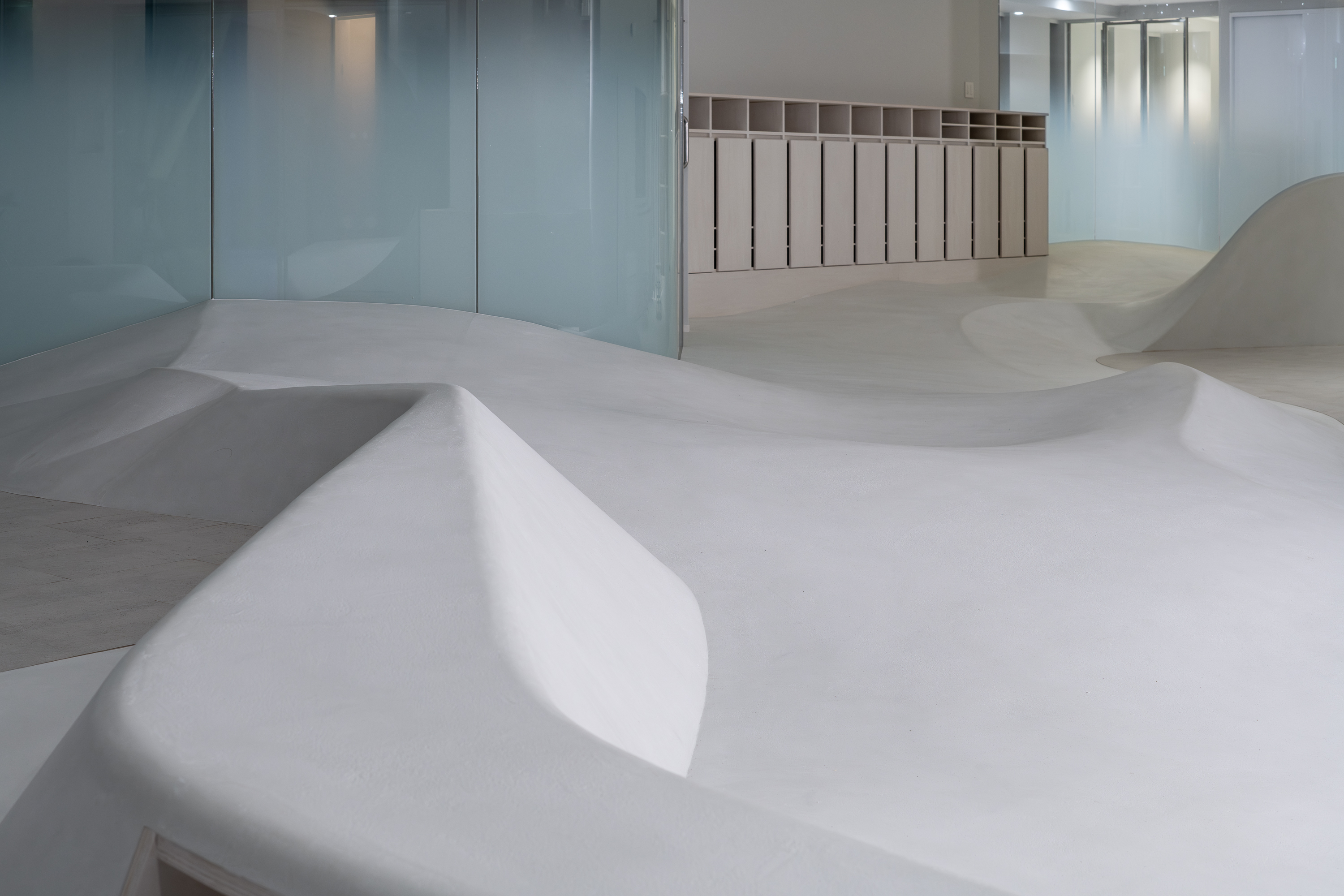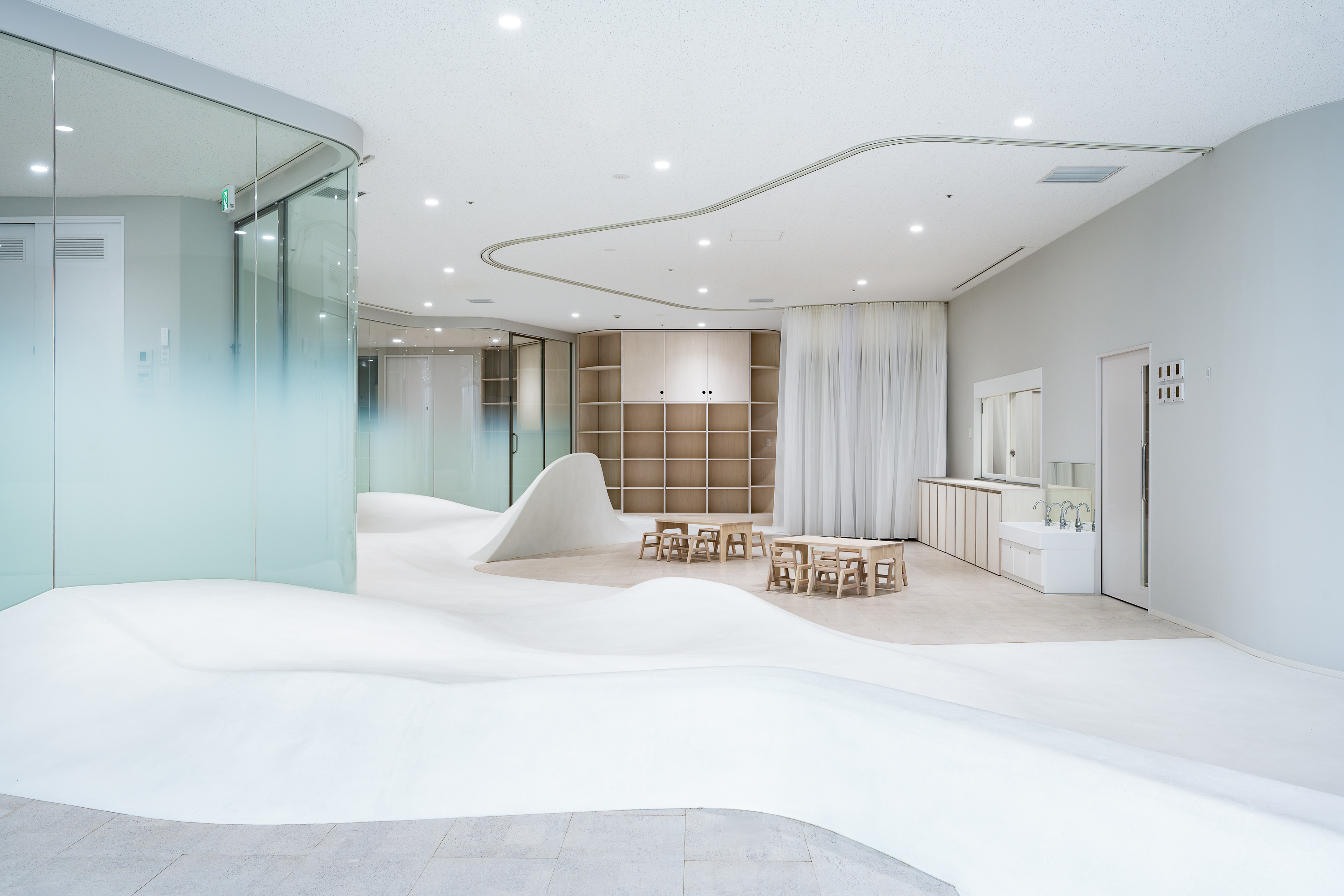 年齢や身長の異なる園児たちの活動に明確な境界を設けず、大らかな大地のような床や曲線で保育園全体を構成することで、各領域や活動が混ざりあい、重なっていくことを目指して制作。