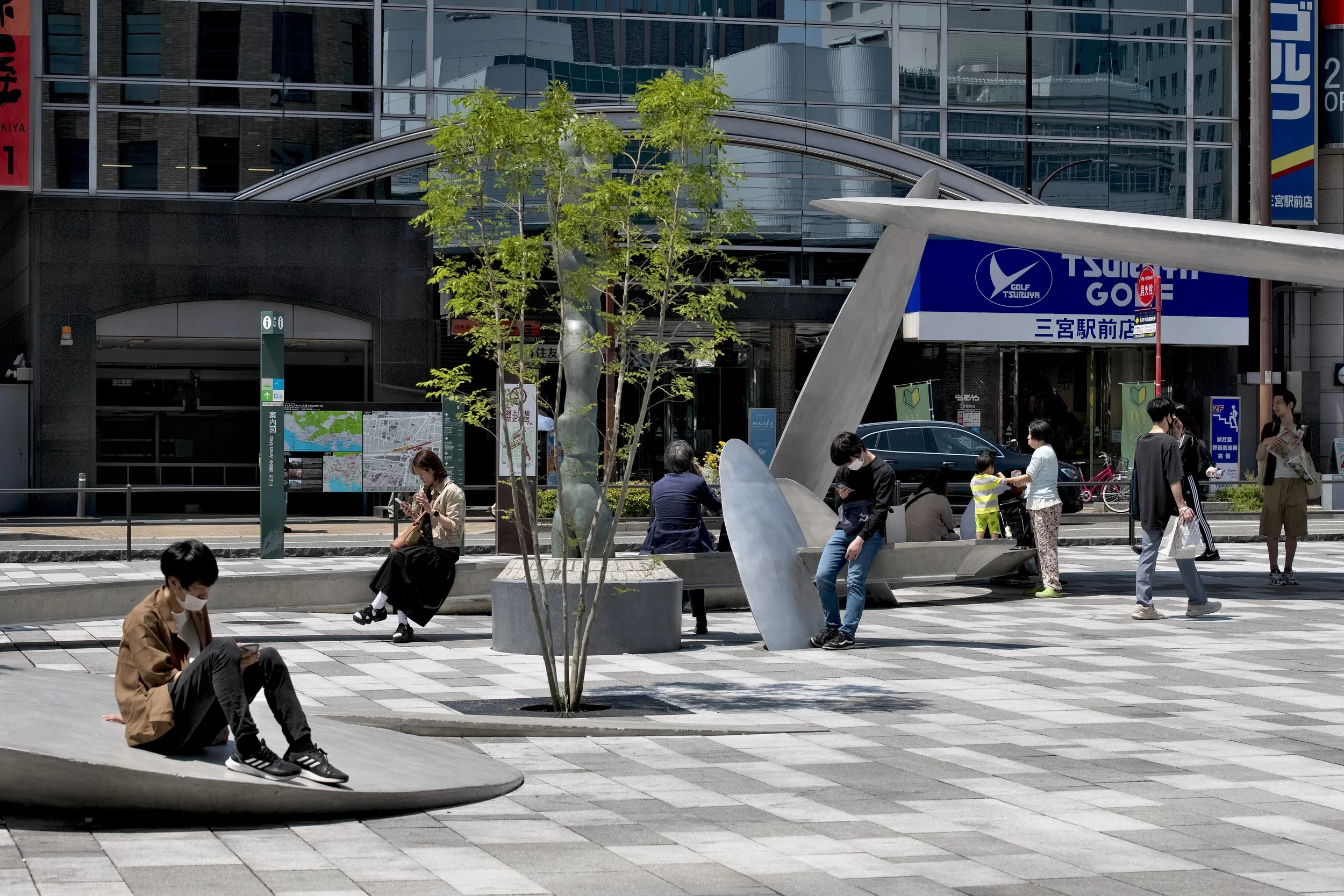 神戸三ノ宮駅前の「サンキタ広場」についてお話しすると、実はあの広場は円弧を描いていて、かつ全体が斜めなので、座面に水平面や垂直面が一切ありません。広場に行っていただくとわかるのですが、内側からも外側からも座れますし、円弧を描いているので、全員が違う方向を向いて座ります。さらに、全員が違う高さのところに座るので、膝の曲げ具合や体の使い方も全員変わってきます。