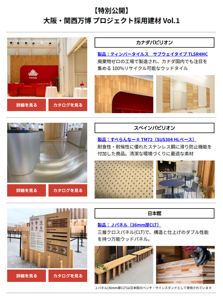 建材ナビ様発信の「大阪・関西万博プロジェクト採用建材特集」を拝見し、会場内で特別展示をぜひ実施いただけないかとお声がけさせていただきました。