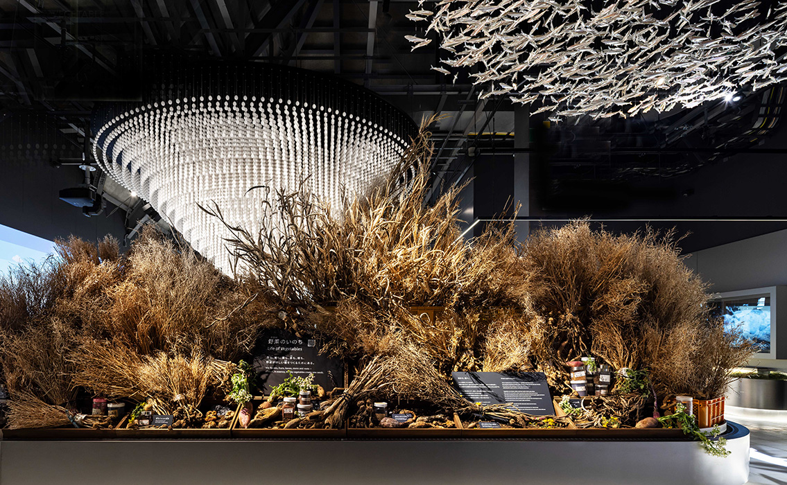 空間を理解するための時間を省き、どこかなじみのある陳列ですべてを表現しているため、来場者は日常の延長の感覚のまま、あとは体感する楽しみに没入できる。小さい命を大きく見せたり、命を色として抽象化したり、多様な視線へと誘導しつつ、来場者自身の命についても思考を促す構成になっている。