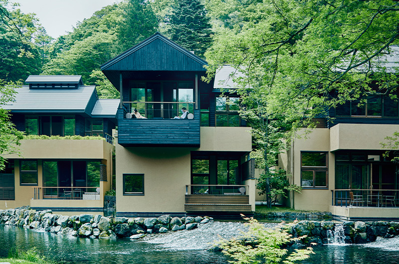 浅間山麓の地形と清流を生かし、森と水の循環を尊重して計画されたリゾート。歩くたびに光や風景が移ろい、自然と共生するランドスケープが滞在体験を形づくる。