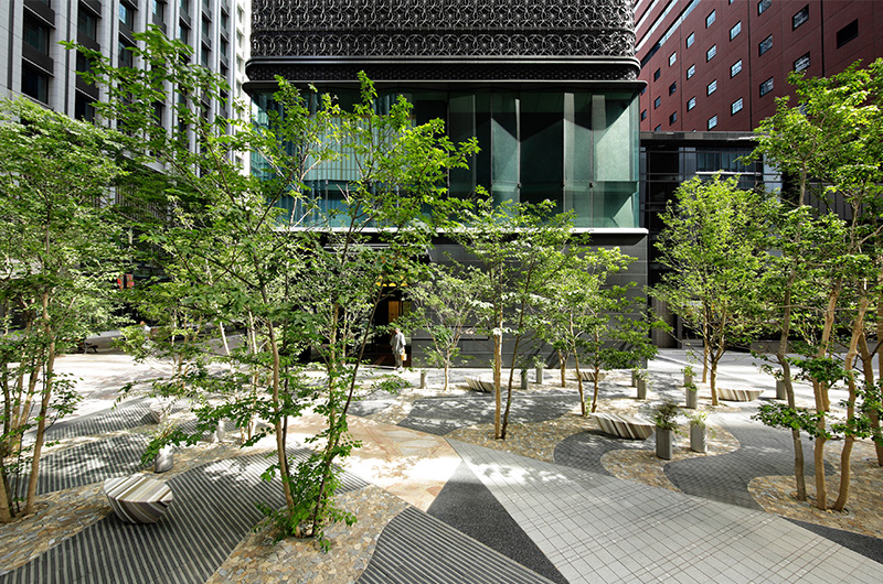東京という場所柄、インバウンドの方も多い。そこで、日本の文化を第一に感じてもらいたいと考えました。パートナーの長谷川とも議論し、着物の帯や江戸小紋のような繊細なパターンを古来からある造園技法で表現することにしました。 着物の帯が地面に敷かれているようなイメージで、自然素材や職人技を感じさせるテクスチャーを用いれば、オフィス街の巨大なスケールの中に手作り感のある「別の場所」としての感覚を作れるのではないかと。