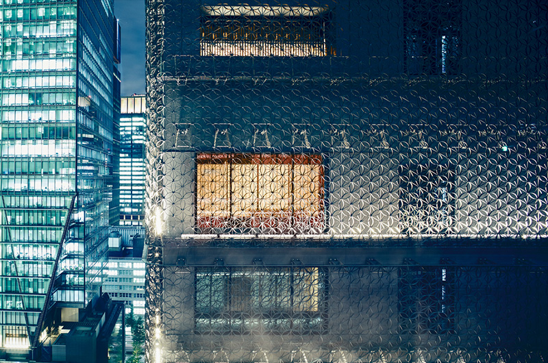 「星のや東京」は、東京の大手町というオフィスビルのど真ん中に温泉旅館を建てるというプロジェクトでパートナーの長谷川と共にデザインに関わりました。本来、温泉旅館は自然の中にあり、塀に囲まれて庭を通って玄関に着くものですが、ここは周りがビルと地続きです。
