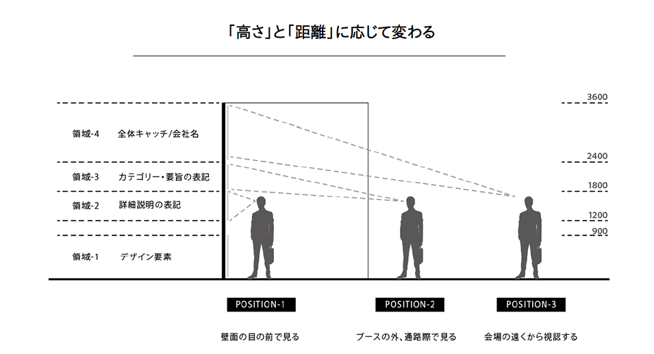言葉は「高さ」と「距離」に応じて使い分けます。10数メートル離れた場所からはブースの上部しか見えません。ですから上部にはメインコピーなど遠くからでも認識すべき情報を配置し、近づくにつれて解像度を段階的に上げていくのが基本です。
