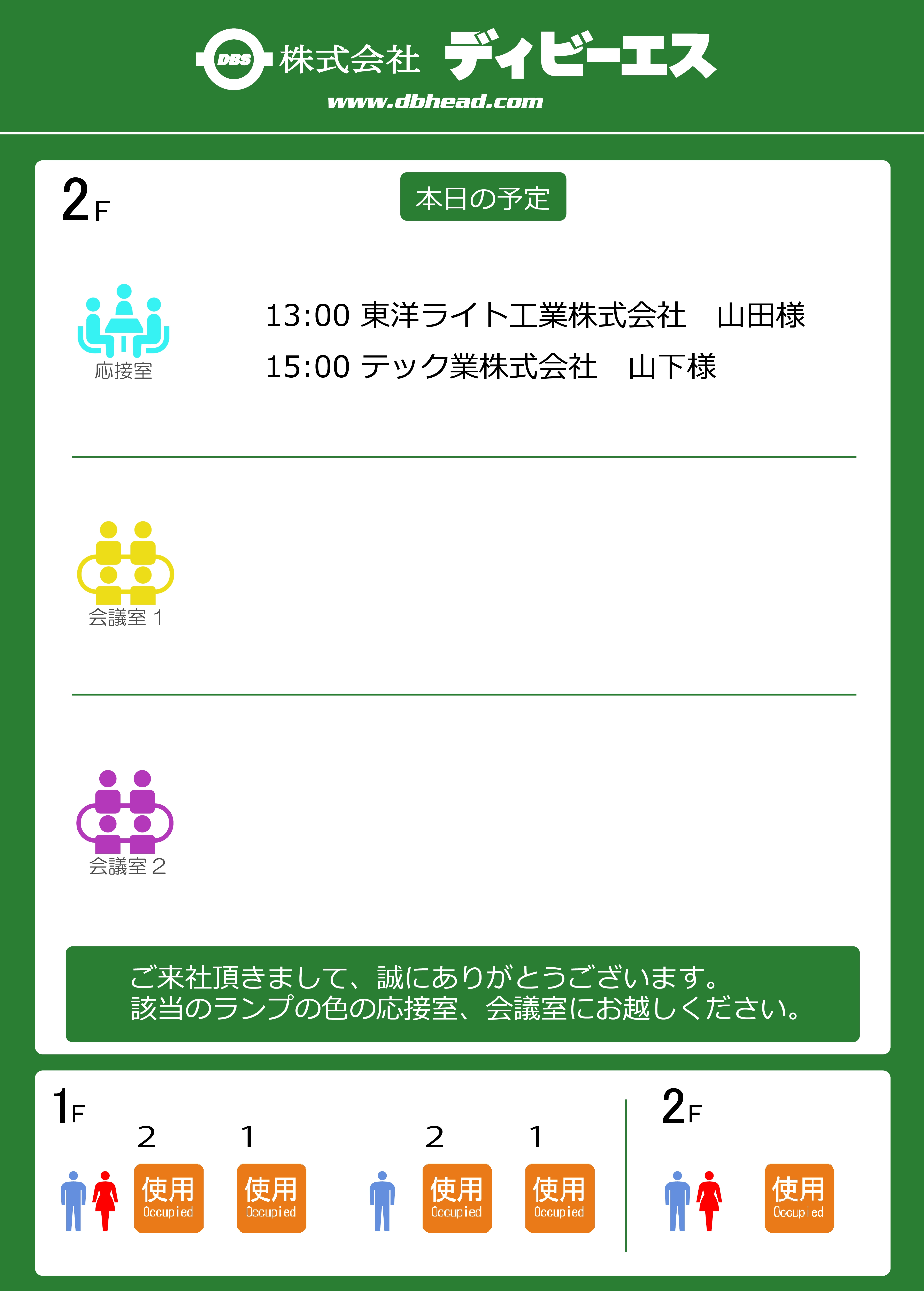 特に、トイレブース単位での待ち時間短縮に加え、当日の来客情報を更新しながら「どの会議室が誰のために確保されているか」を色分け表示できる点が好評でした。