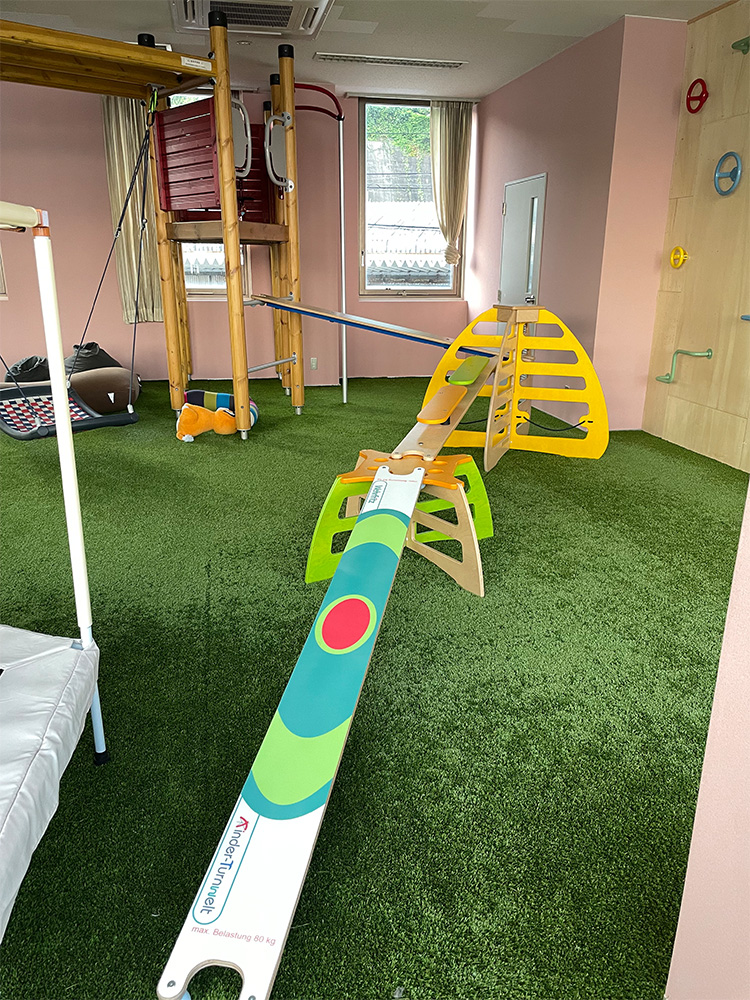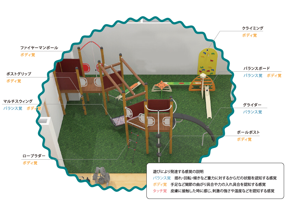 今回導入したのは、子ども達が夢中になってからだを動かしながら、多様な感覚や運動能力を育める屋内アスレチックです。バランス感覚やボディ感覚を刺激する遊びの要素を取り入れることで、遊びを通して子ども達の成長の糧になる感覚を引き出せるよう設計しました。