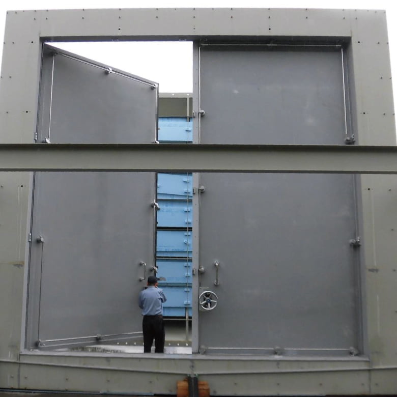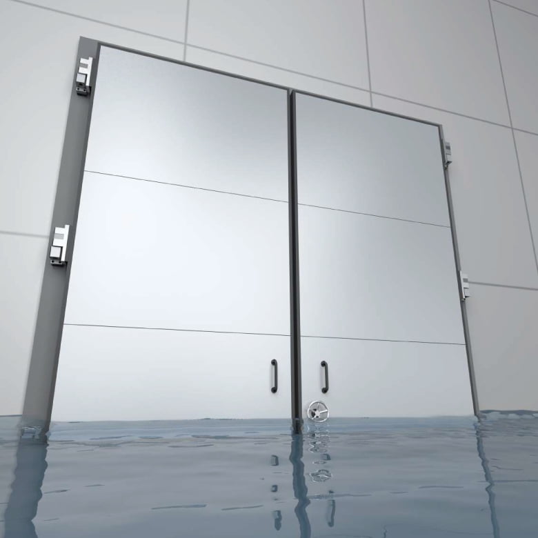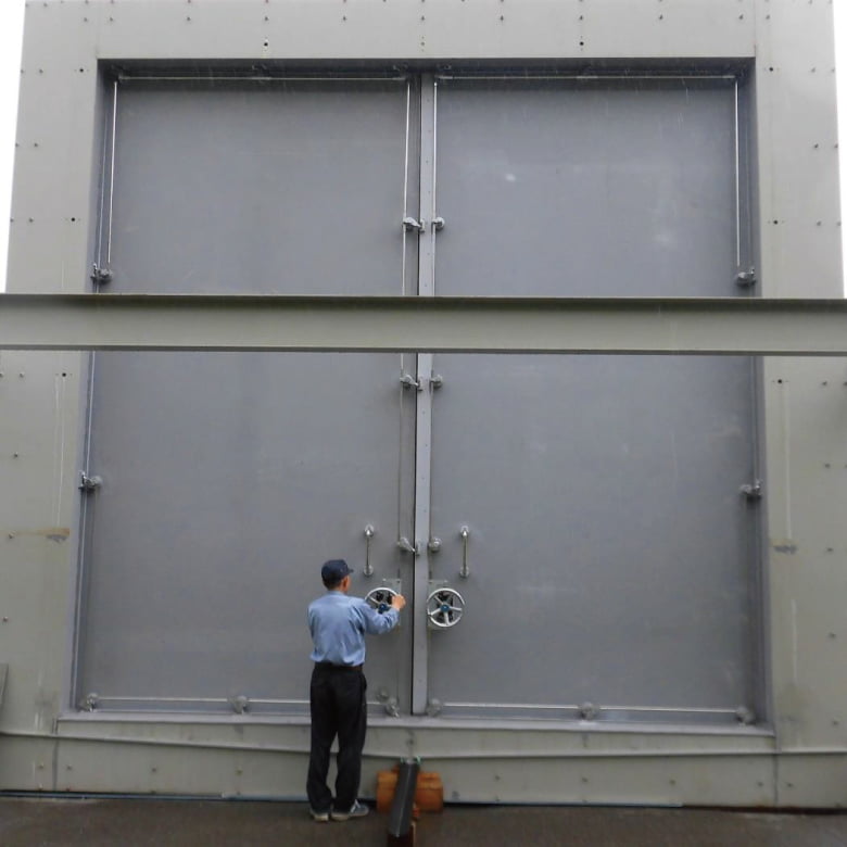 防水板・防水扉「ミズガード」シリーズを製造販売している豊和工業株式会社では、さらなるお客様のご要望に対応すべく、「スイング式大型防水扉」を新たにラインアップ。既に販売を行っている、スイング式防水扉(止水高さ3m)に加え、止水高さ5mに適応可能な大型防水扉です。