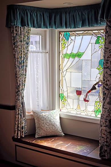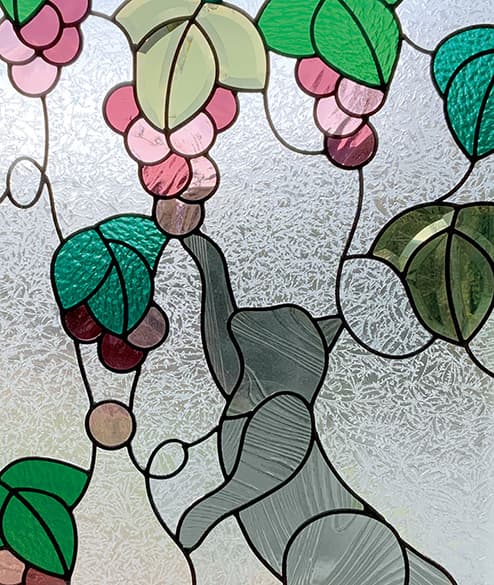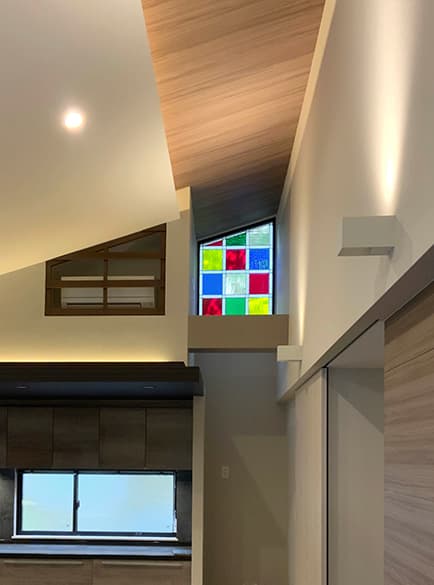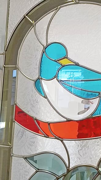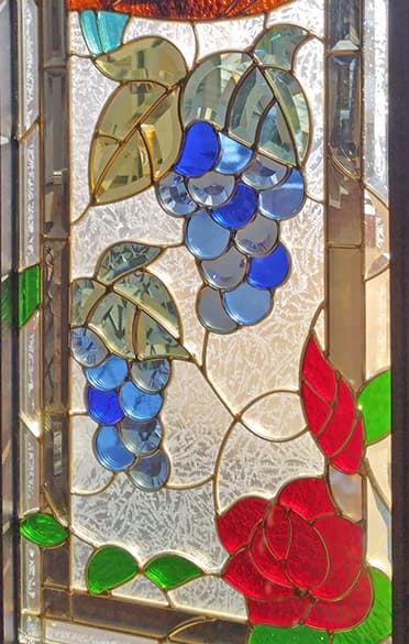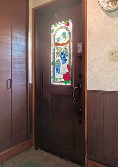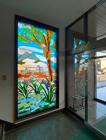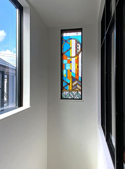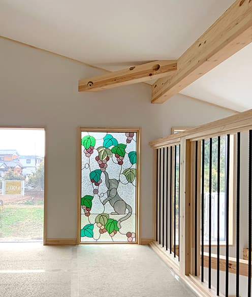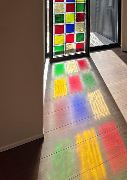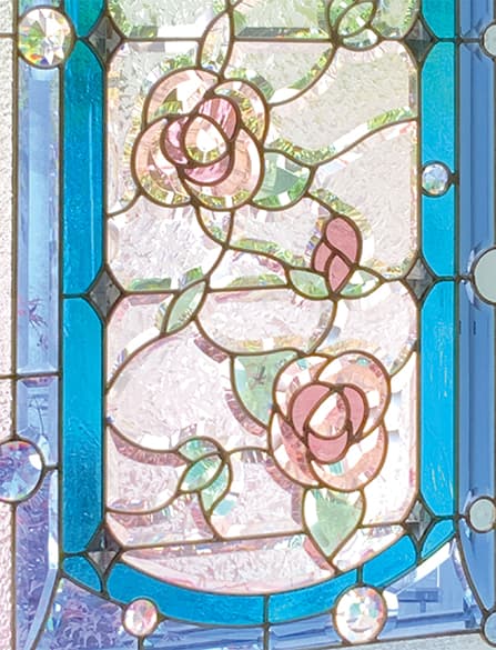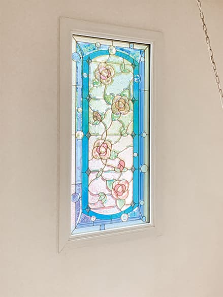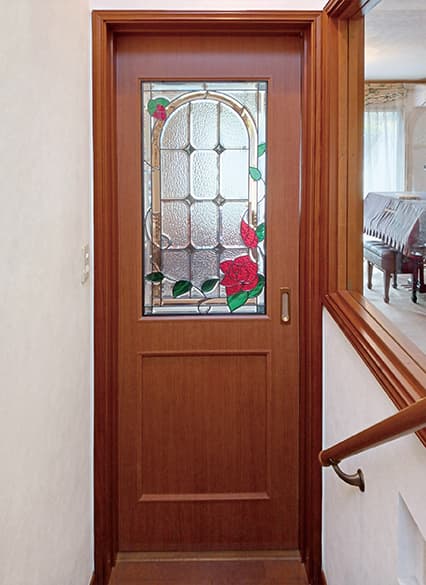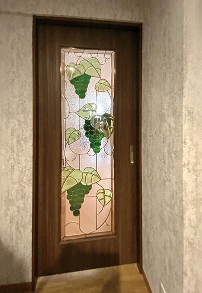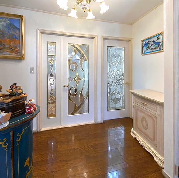 「ピュアグラス」は、平面ガラスだけではなく、面取りガラスを取り入れたことで、ステンドグラスに質感と共に、宝石が放つような輝きを実現。両面に強化ガラスを張り合わせた三層構造なので、強固で破損しにくく、防犯・断熱・防音の効果も期待できます。