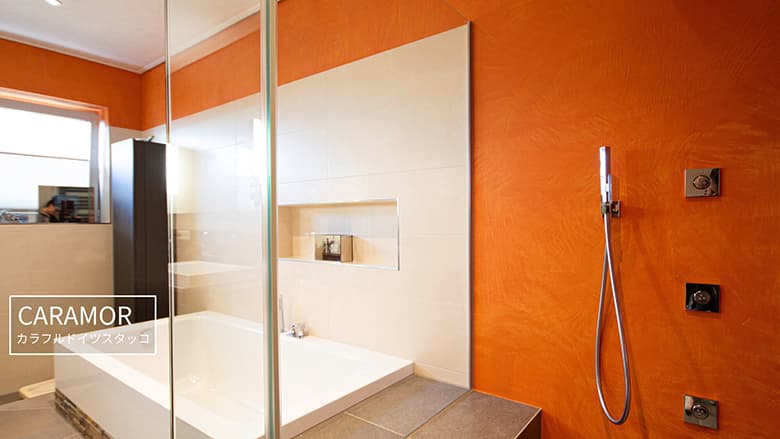 ドイツ発祥の「FRESCOLORI(フレスカラリ)」は天然大理石と石灰をベースに、自然原料を96%以上使用。調湿性や消臭効果を発揮しながらも、従来の左官仕上材では実現できなかった発色性により、美しく快適な空間を実現。
