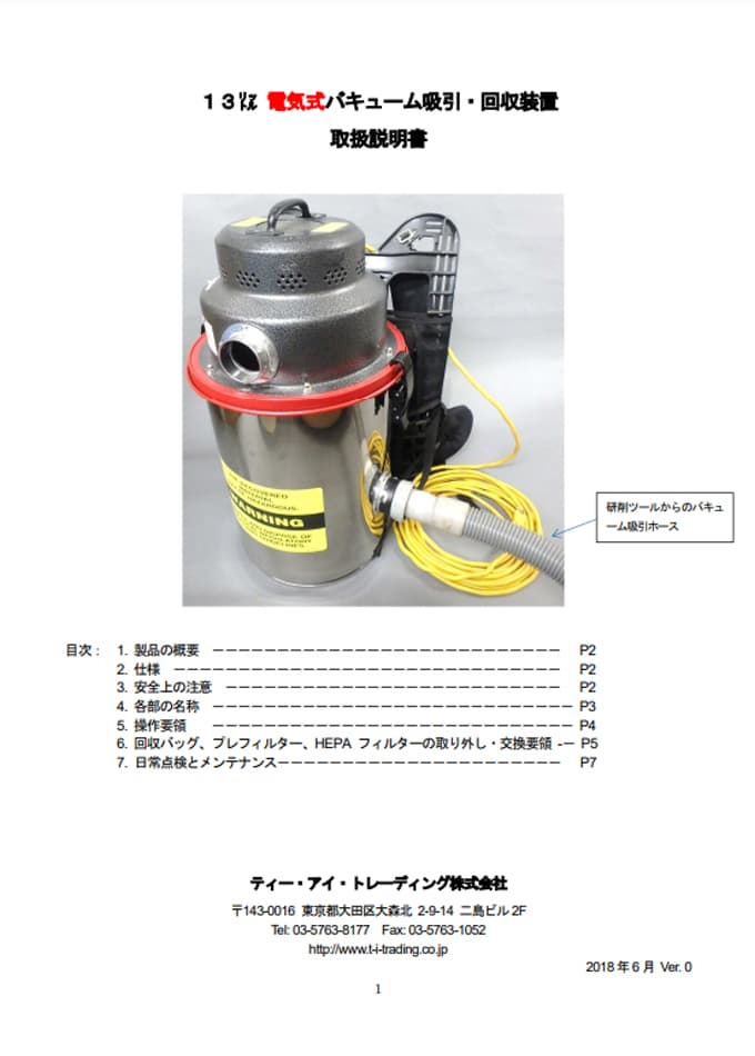 100 ~ 120VAC 50/60Hz の電気を駆動源として内部吸引ブロアーで強力な真空を発生させ、研削ツールと真空ホースで接続し研削ツールの先端で研削に伴い発生する粉じんを吸引しダストレスの作業環境を提供。装置の内部には回収ダストを収納する回収バッグ、大方のダストを取り除くプレフィルター、0.3 μmの微粒子を99.97% 以上取り除くHEPAフィルターが組み込まれています。
