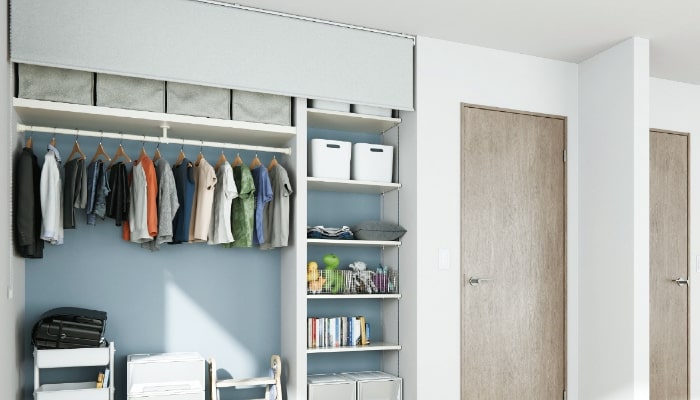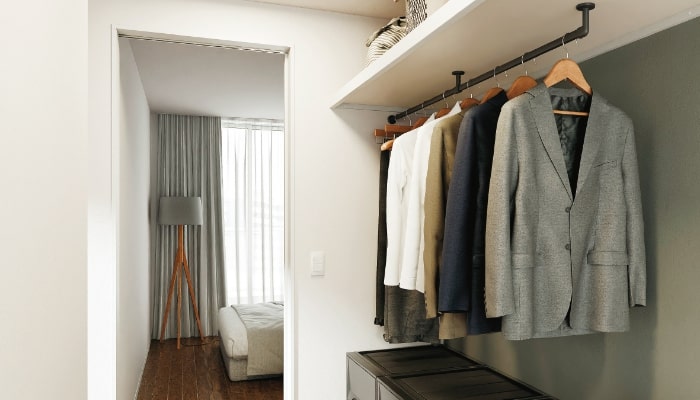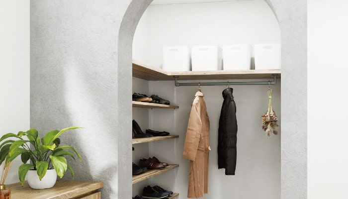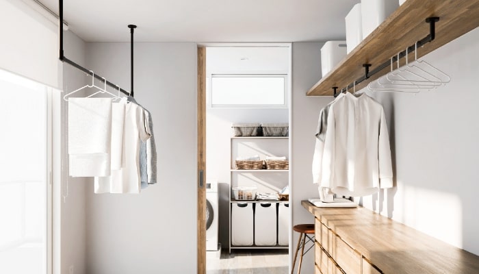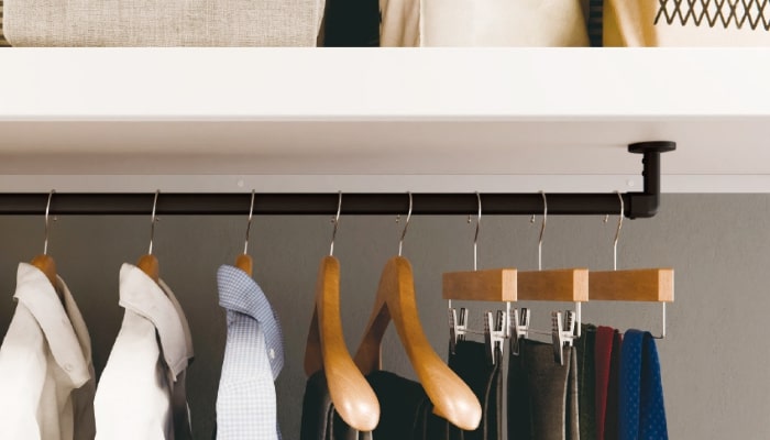 オープンクローゼットなど見せる収納をおしゃれに演出する収納シーン専用のハンギングバー。許容荷重30㎏でファミリークローゼットなどたくさんの洋服を掛けたいシーンにもオススメ。