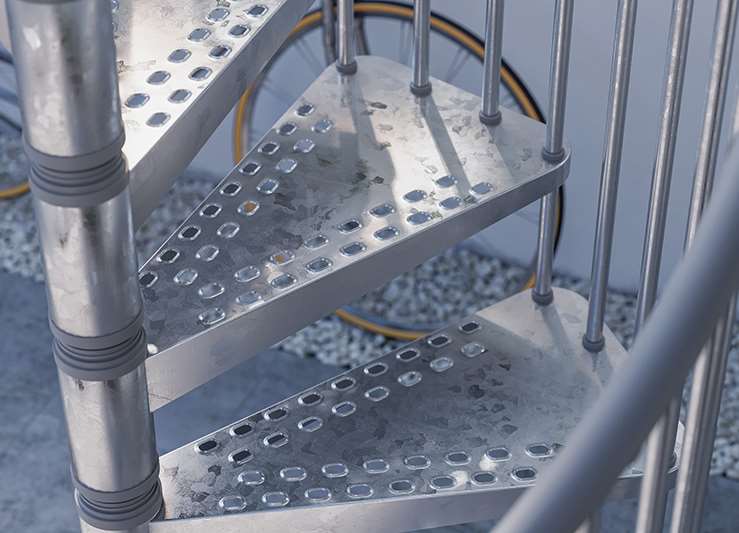 さまざまな環境に耐用する丈夫な屋外用螺旋階段です。支柱は、踏板を溶接したスチール製モデュラー支柱。