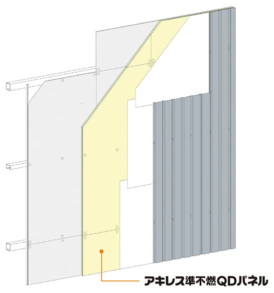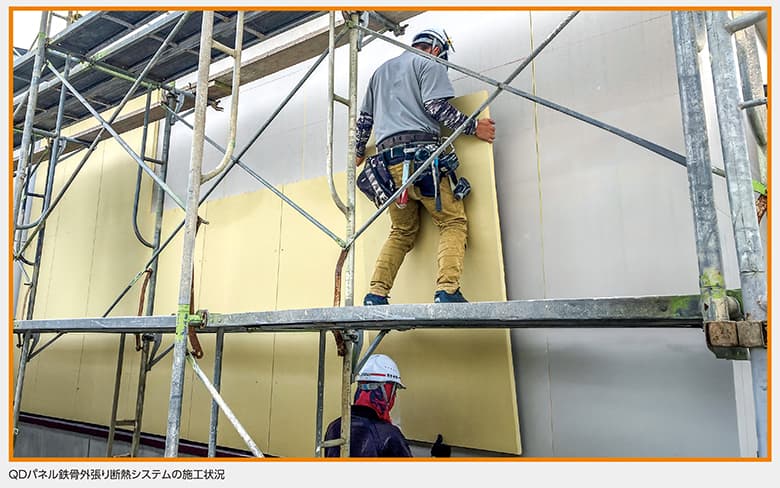 鉄骨造建築物の外壁向け外張り断熱用パネル。外張り断熱により、熱橋部からの熱損失を抑制し、暖冷房負荷を軽減します。躯体を保護し、熱橋部の結露リスクの低減が図れます。