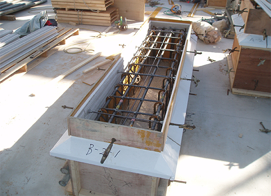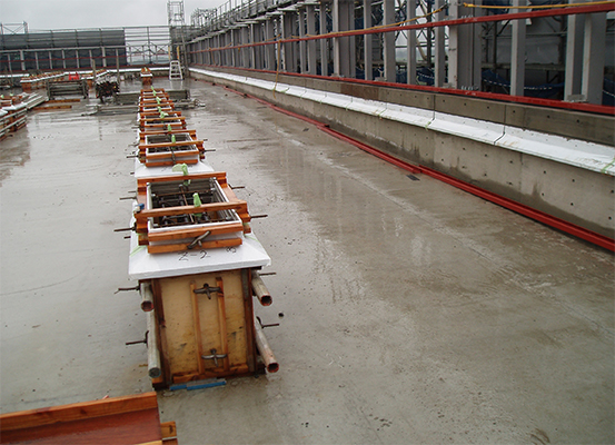 「エレック型枠工法」は、コンクリート用型枠合板などに替わり、一部中空の無機質 (セメント質) 押出成形部材を打込用コンクリート枠材として使用する工法です。成形品のため仕上がりが美しく、コンクリートの中性化を防ぎます。