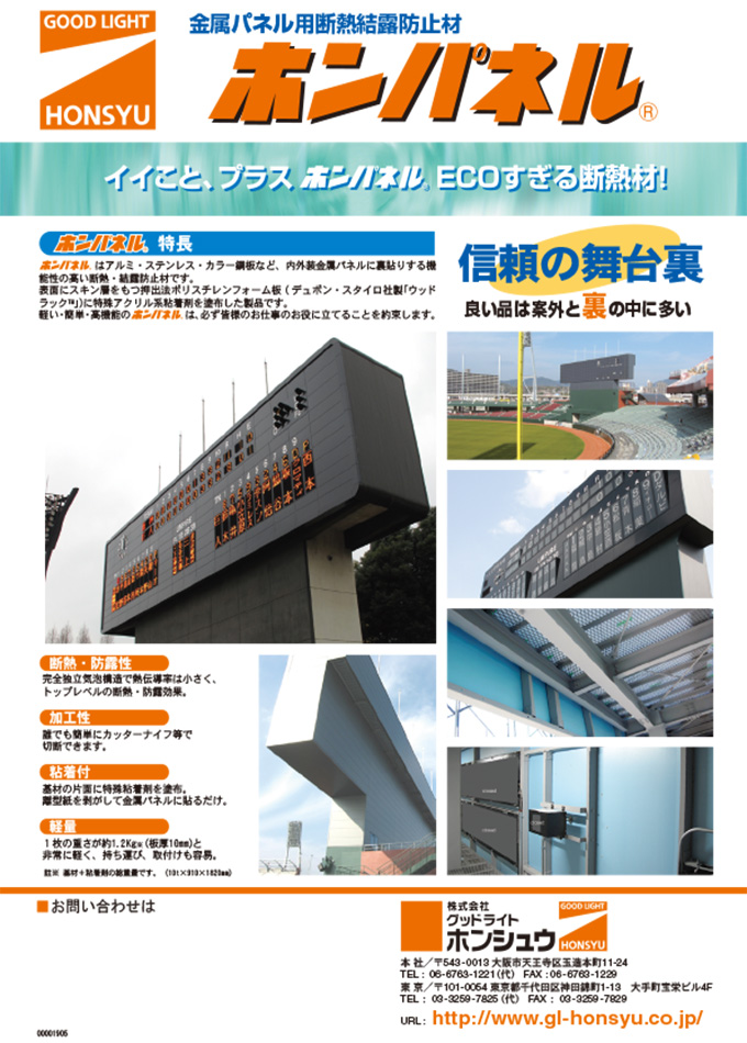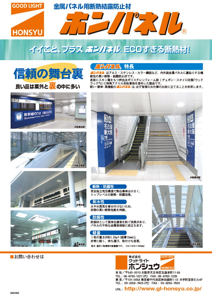 断熱材や塗料、産業フィルムなどの商品を中心に事業展開する株式会社グッドライトホンシュウの総合カタログ。軽くて高機能な金属パネル用裏打断熱結露防止材「ホンパネル」、幅広い分野で使用されているポリオレフィンフォーム断熱材「ペフ」、高性能制振樹脂を不織布に含浸した軽量シート「サウンドプルーフ」など、多様な商品を掲載しています。