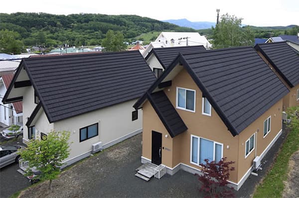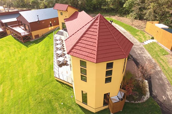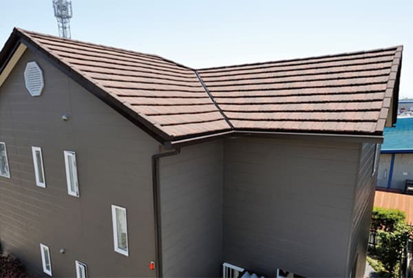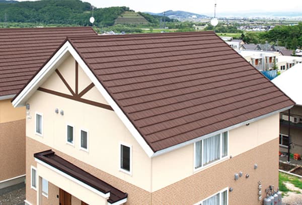 「コロナ(CORONA)」は、美しい杉板模様の屋根材です。天然石ストーンチップとガルバリウム鋼板を使用。