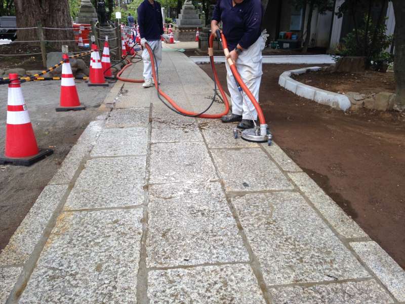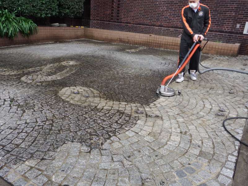 あらゆる路面に対応可能で、インターロッキングに生えるコケや、タイル平板の目地部分、小舗石の深い目地なども洗浄できます。