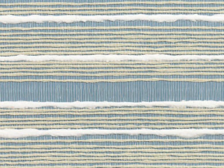 経糸には細くて荒目の糸、緯糸には紙糸と、糸になる前のスライバー糸に加え、特殊技法でわざと隙間をつくり、裏打ち紙の色と肌を「借景」とする遊び心を添えました。