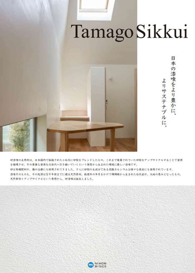 長い歴史と伝統があり優れた調湿性・消臭性のある漆喰に、これまで白卵に比べて再利用があまり進んでいなかった赤卵の殻を混ぜて活用することにより、よりエコロジーで豊かな漆喰を実現した商品です。卵殻は多孔質で気孔の多い性質があるため更なる調湿機能の向上が見込めるほか、天然素材による消臭機能、リユース素材を積極的に使用することによりエコロジー性能にも優れています。