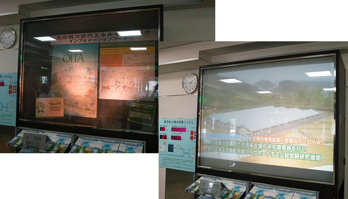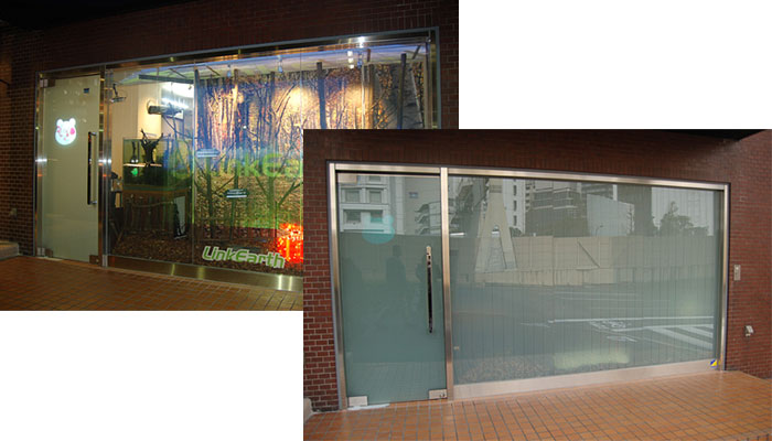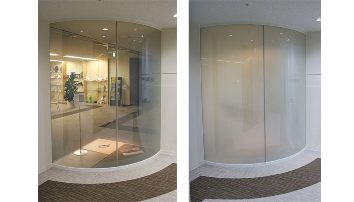 電源がOFF時に透明、ON時に白色となる高機能性液晶フィルムです。通常の調光フィルムは電源OFF時に白色(見えない状態)になりますが、このフィルムは独自の新技術によって、電源がOFF時は液晶を同一方向に整列させ、光を衝突させずに目で見える隙間を通過して透明に見えるように、電源がON時は交流電圧を加えて液晶を拡散し光が液晶に衝突して白色に見えるようにしました。