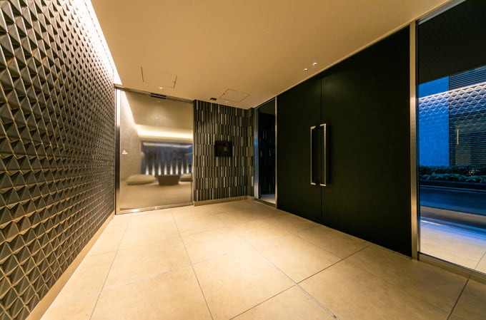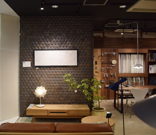 「モデルシックス/モデルシックス+」は、株式会社虔山が取り扱う装飾タイルです。ベースとなる六角フォルムに補助線を加えることで生じるトライアングルパターンをデザインしたモデルで、焼き物でありながらメタリックな印象をもちます。