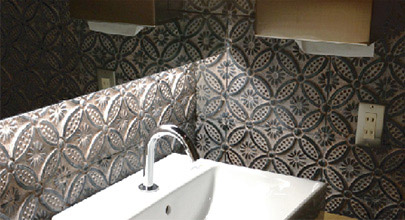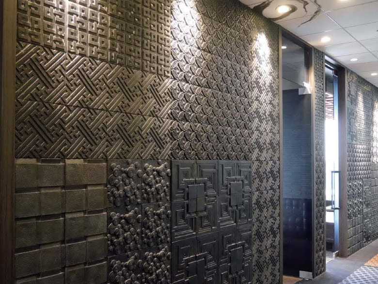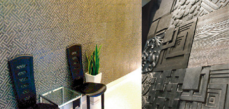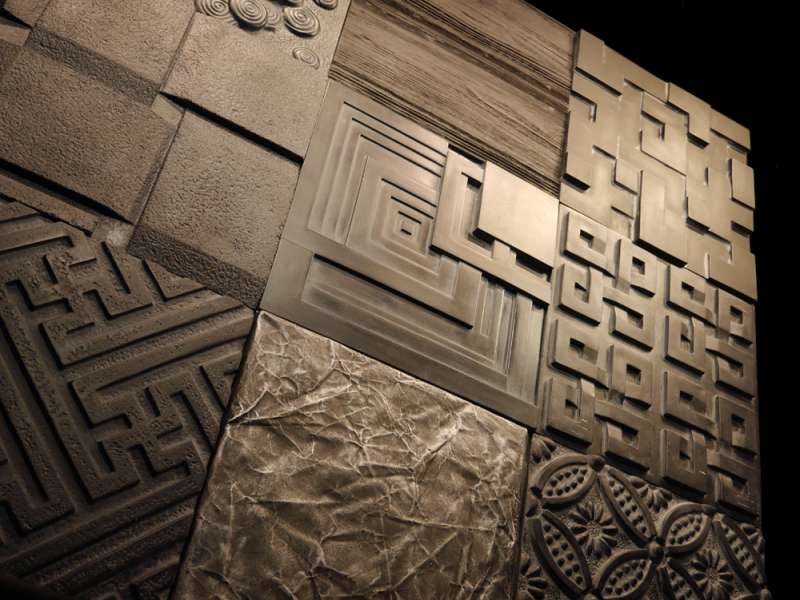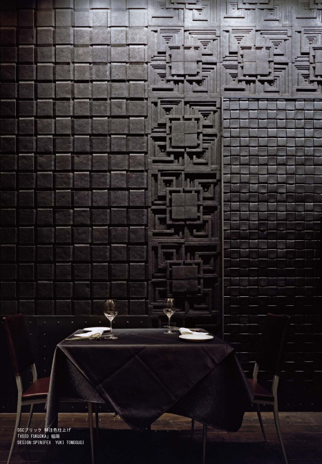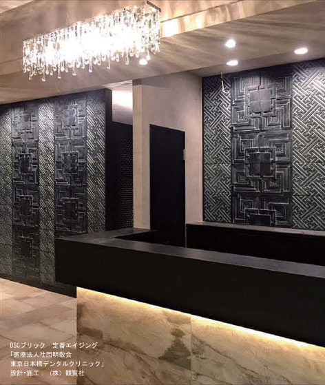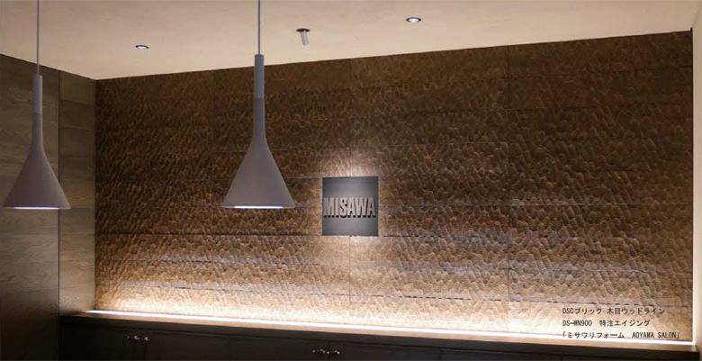 石材のような質感を持つ、GRC(ガラス繊維強化セメント)製のセメントタイルである「DSCブリック」は、静岡県富士市にある自社工場にて全てを生産しており、自由な仕上げとアレンジによるカスタマイズ対応が可能です。エイジング加工は、黒那智石や白那智石が劣化したような表情を持つ存在感のある仕上がりとなります。オプションで、エイジングの劣化の色合いを指定することができます。