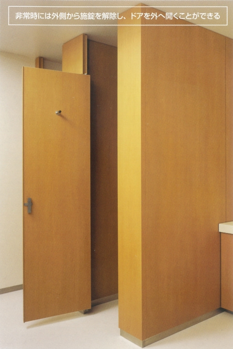 「ライフテクト」は、非常開錠機能が付いたトイレブースです。トイレブース内での事故(利用者の急病や異変等)があったときでも、