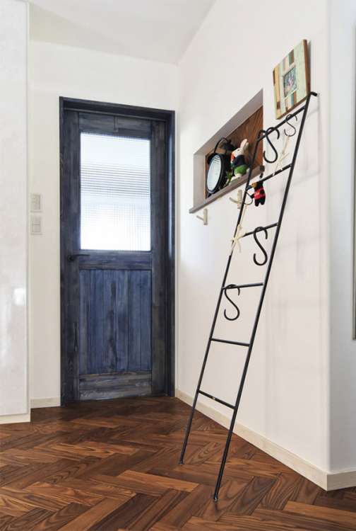 白い壁にビンテージカラーのドアでアクセントをつけたり、