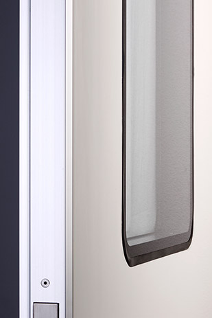 『フルフラットドアDRF50』は、フラットを極限まで追求した、クリーンルーム用ドアの決定版です。フルフラットドアDRF50は、取手と錠前以外の凹凸を排除したアルミフラッシュドアです。チリや埃などが溜まる原因となる金物や覗き窓のわずかな突起も徹底的に取り除いた清掃性の高い扉で、GMPを意識して開発されました。下枠なしでもJIS最高のA-4等級(片開き-ボトムタイト-グレモンハンドル仕様)という高い気密性を有する優れものです。