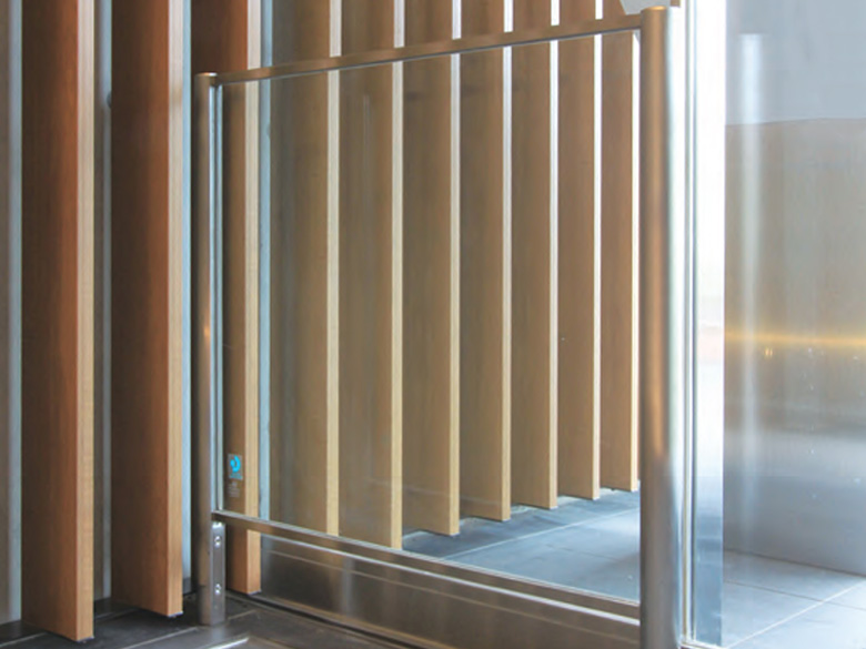 「STガードII」は、自動ドア戸袋側の接触や衝突を防止する自動ドア用防護柵です。JIS A 4722「歩行者用自動ドアセットー安全性」準拠。